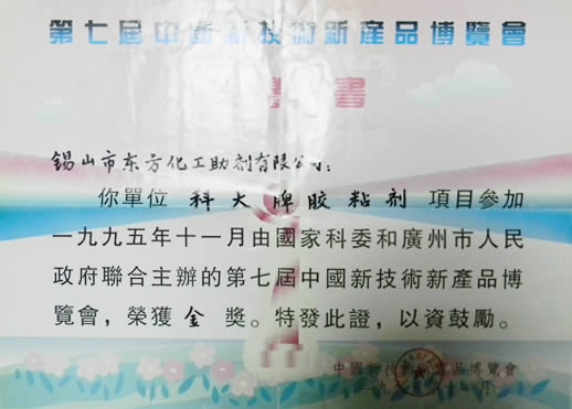 科大牌1213耐油硅酮密封膠、700系列硅橡膠粘合劑榮獲第七屆中國(guó)新技術(shù)、新產(chǎn)品博覽會(huì)金獎(jiǎng)。